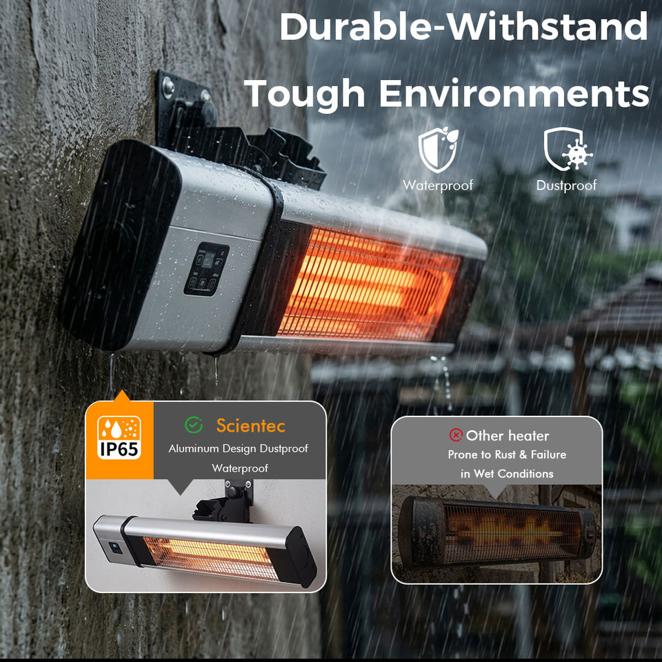 Grado de protección IP65: Con una clasificación IP65, el calentador está protegido contra el polvo y los chorros de agua, lo que lo hace adecuado para su uso en diversas condiciones exteriores.