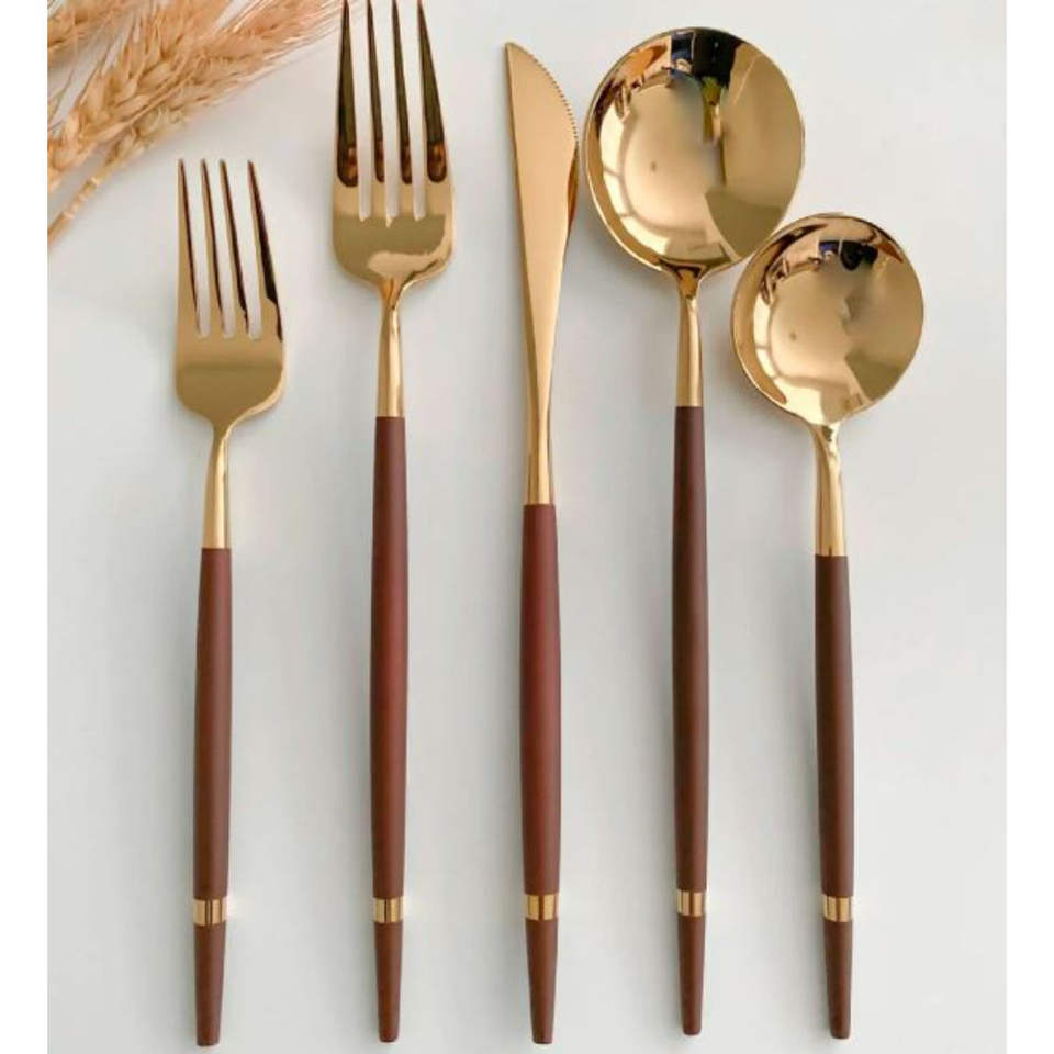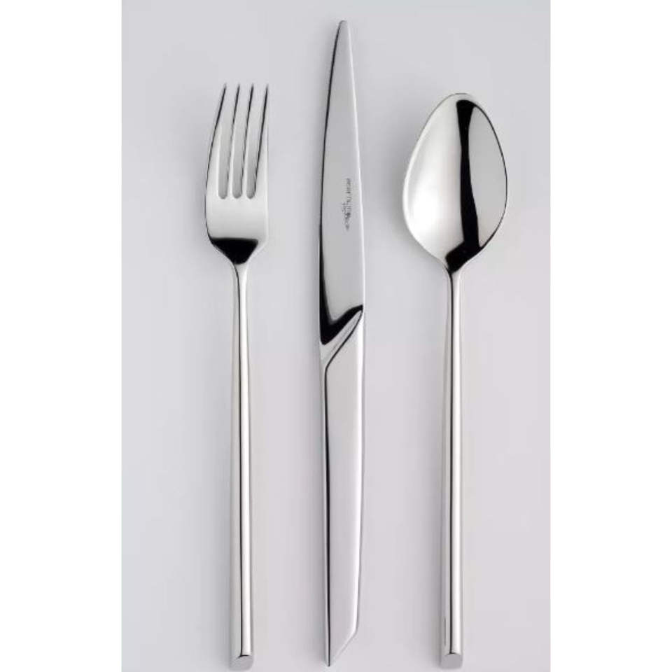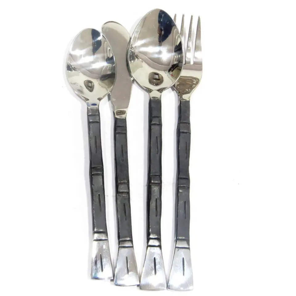 Juego de cubiertos metálicos de diseño moderno para restaurante, hotel, buffet y servicio de catering con elegante superficie pulida a espejo.