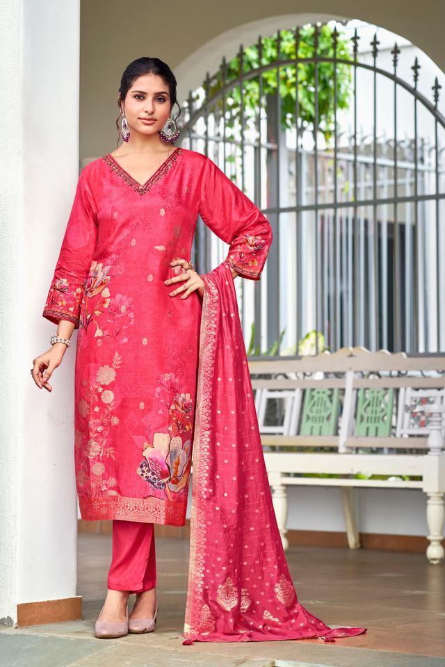 Nombre del producto:Últimas viscos puro ruso Dola seda Kurti con pantalón y Dupatta