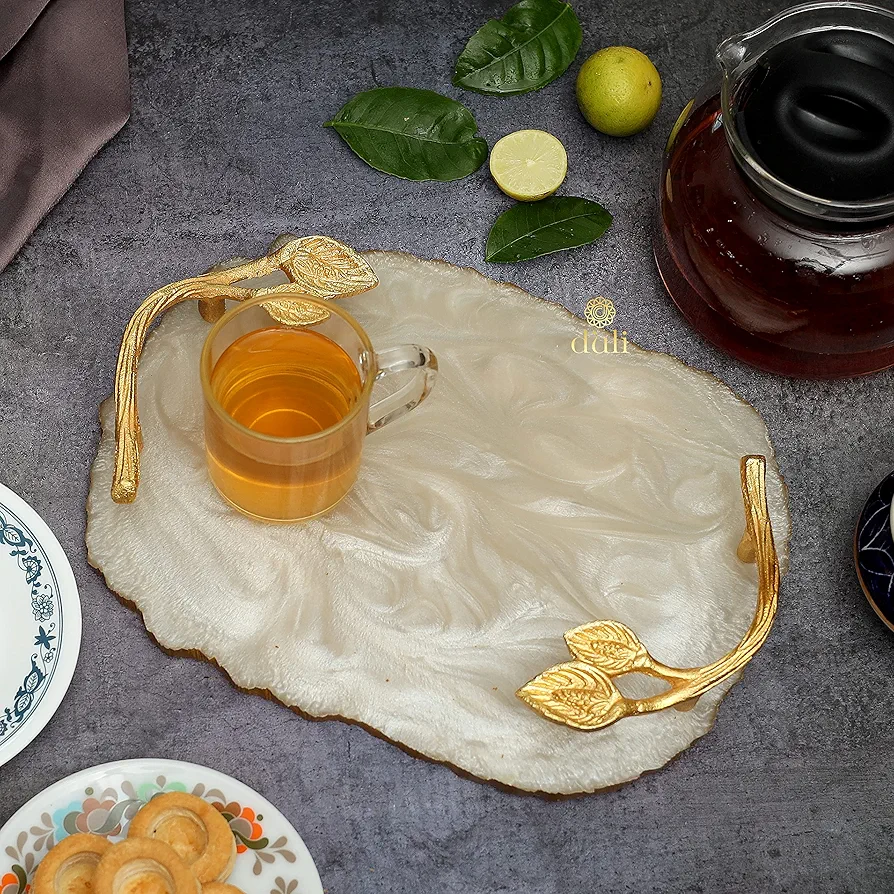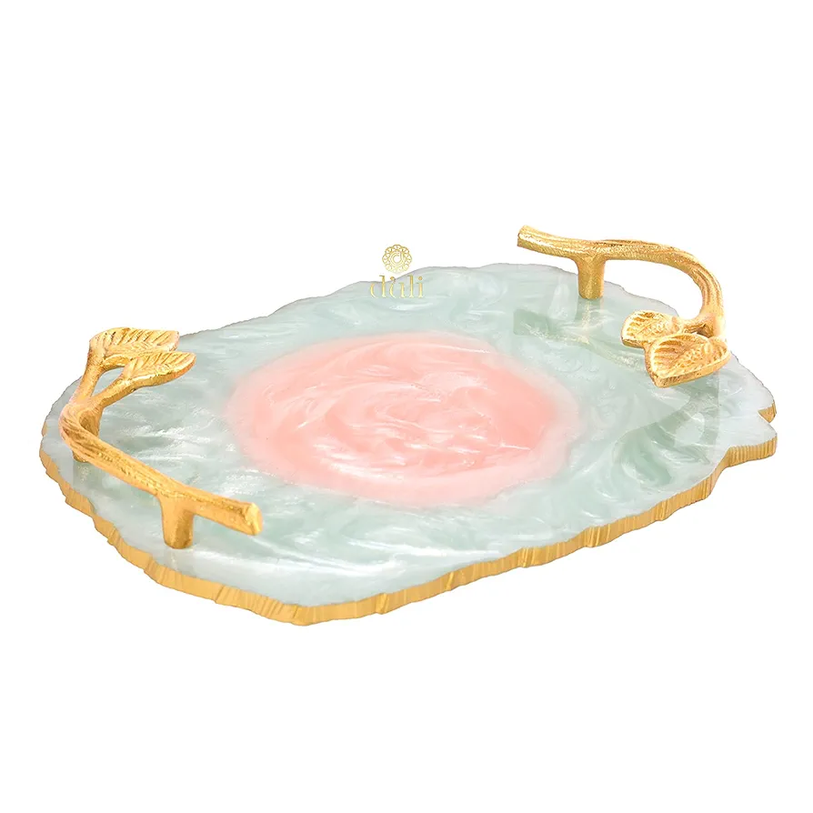 Bandeja de resina de diseño moderno Bandejas para servir de último diseño Mango de metal Utensilios de cocina Artículo de mesa Ecológico a precio al por mayor 2025