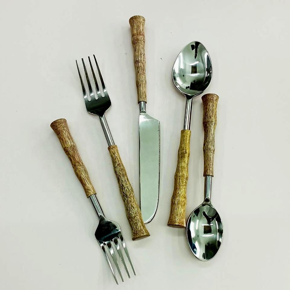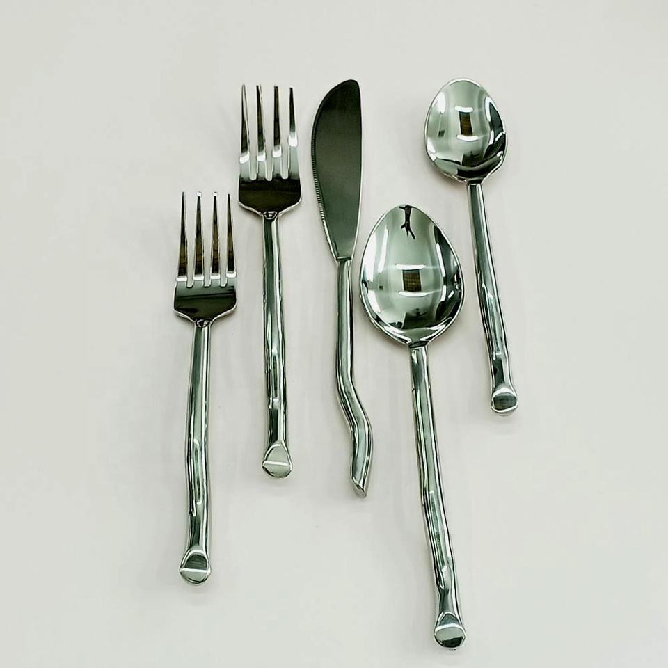Juego de cubiertos de diseño moderno de acero inoxidable hecho a mano con mango de diseño ondulado de Metal pulido para boda