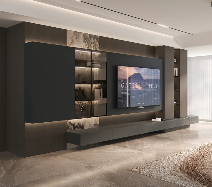 Gabinete de pared de diseño moderno, gabinete de TV, Material de madera y vidrio, muebles de sala de estar, gabinete de TV para el hogar con función de almacenamiento