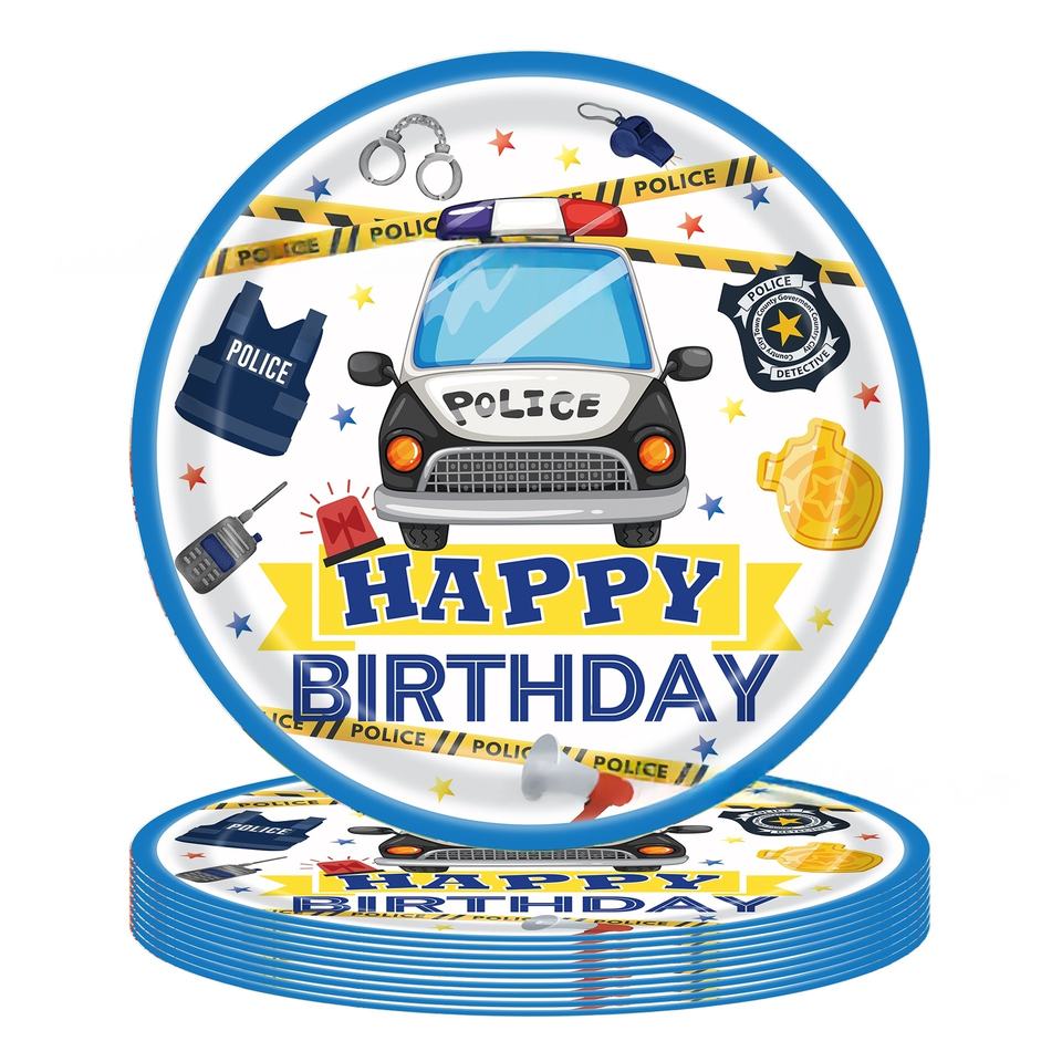 Juego de vajilla desechable moderna para fiestas de cumpleaños de niños, tema de coches de policía, vasos de papel, platos, cajas de pañuelos, superventas