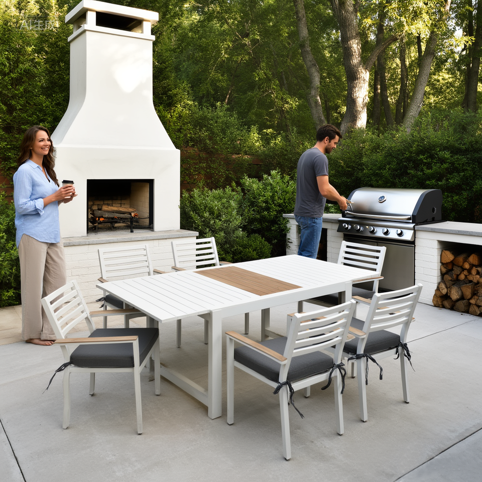 Conjunto de Comedor de Aluminio Moderno, Resistente y Portátil para 6 Personas, Mesa de Patio Extensible, Sillas Acolchadas, Ecológico
