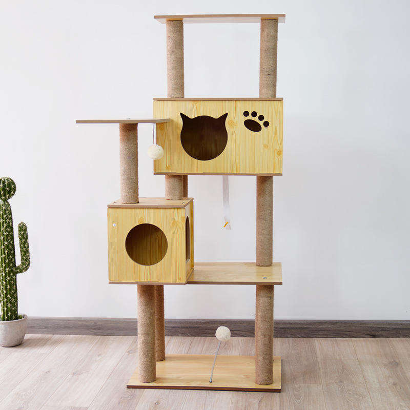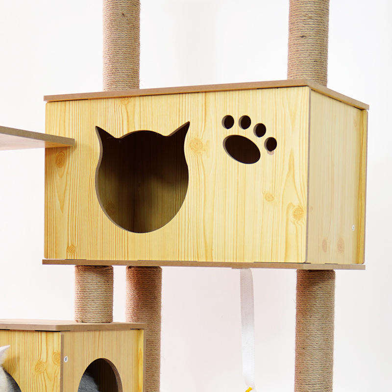Árbol rascador moderno y ecológico para gatos grandes, con mesa de salto, nido, tabla rascadora, estructura de madera para trepar y poste para afilar garras