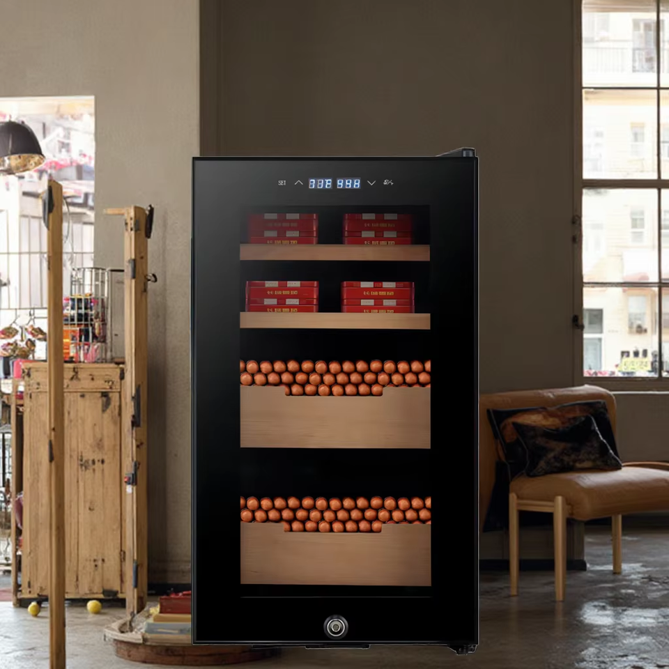 Gabinete de humidor de cigarros eléctrico moderno con higrómetro digital Cajones forrados de cedro español Listo para viaje de madera