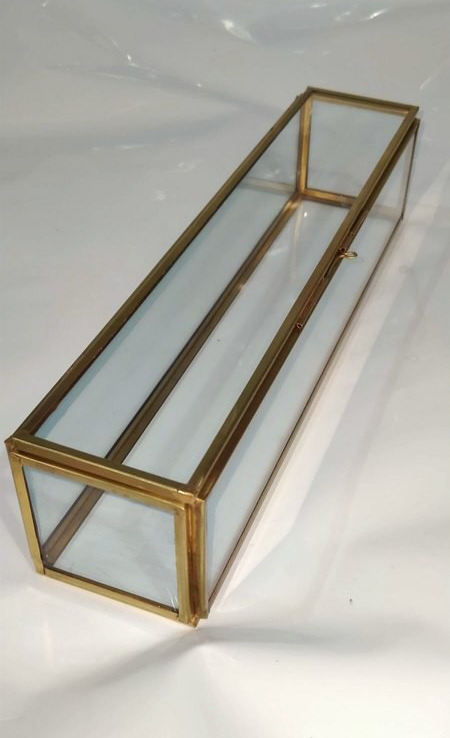 Caja larga de cristal transparente con forma rectangular exclusiva moderna, caja de cristal de recuerdo de flores y joyas, decoración de hogar y oficina con acabado dorado
