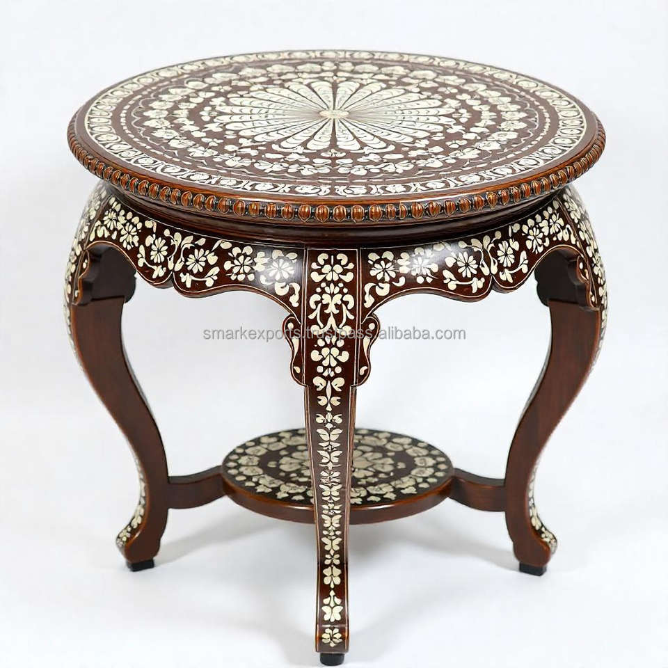 Nombre del producto:Elegante Mesa Redonda de Madera con Incrustaciones de Hueso