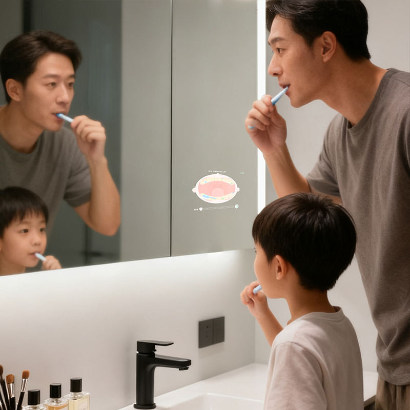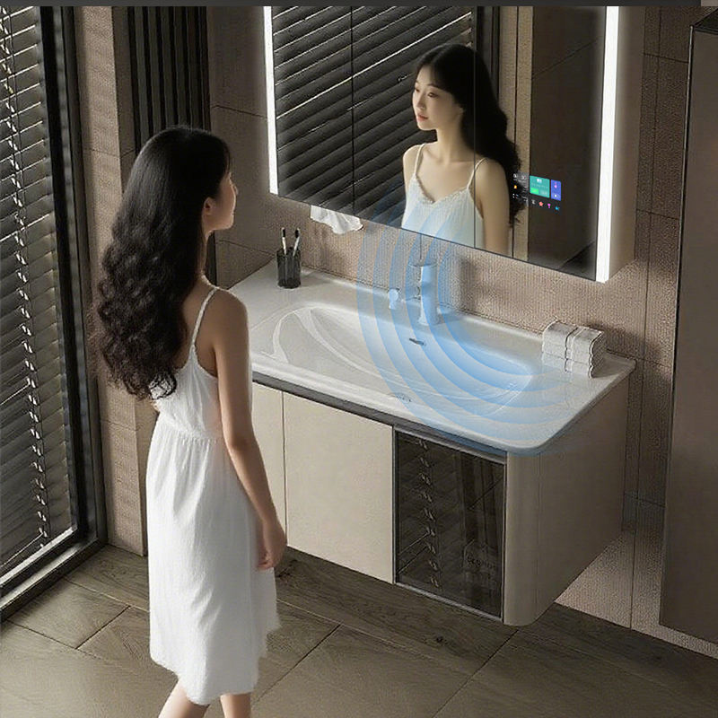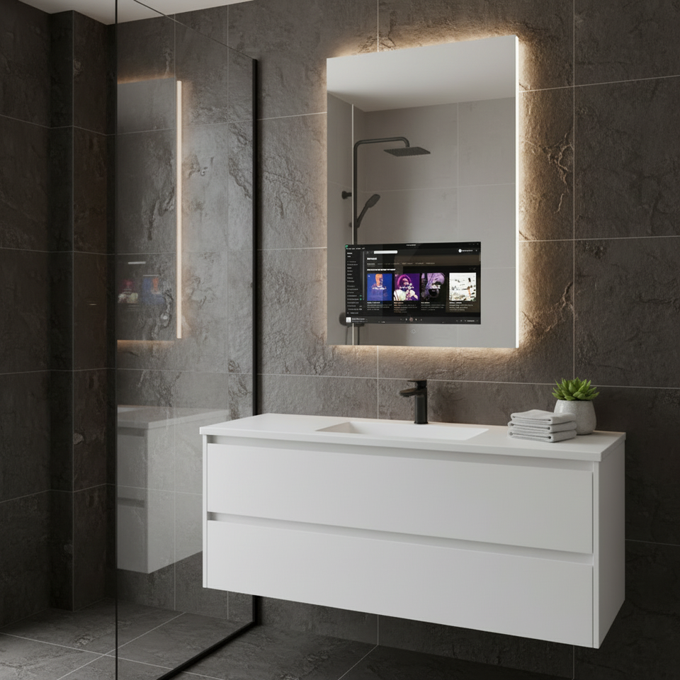 Espejo LED Inteligente Moderno sin Marco con Pantalla Táctil Android, Desempañado por IA, Música Bluetooth y Estación Meteorológica para Renovación del Hogar