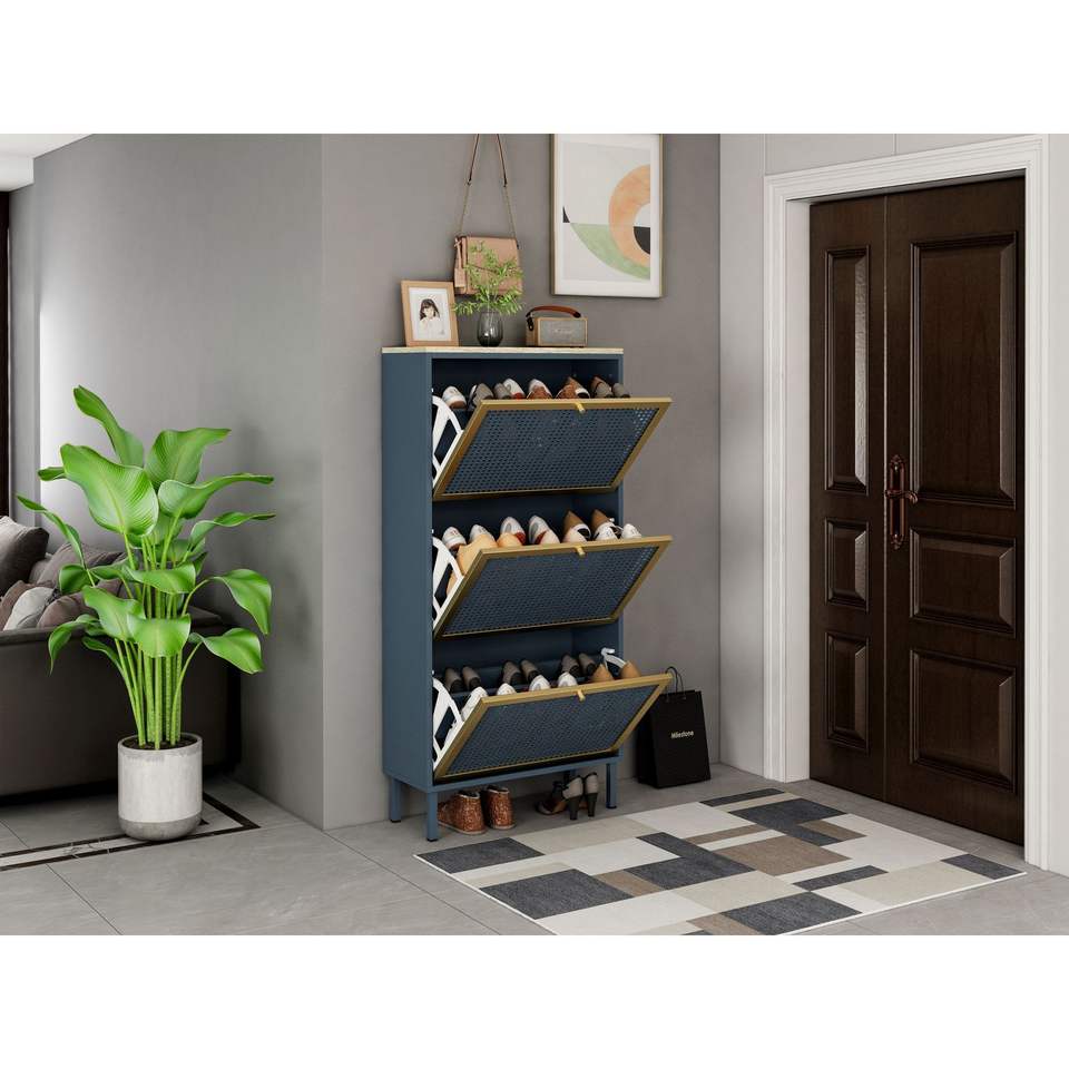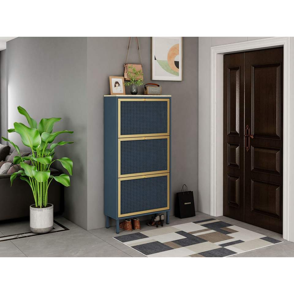 Moderno Zapatero Metálico de 3 Puertas con Ratán, Mueble de Almacenamiento para Entrada