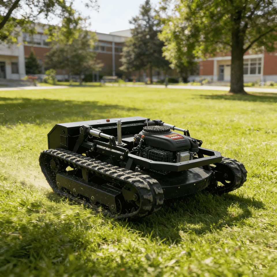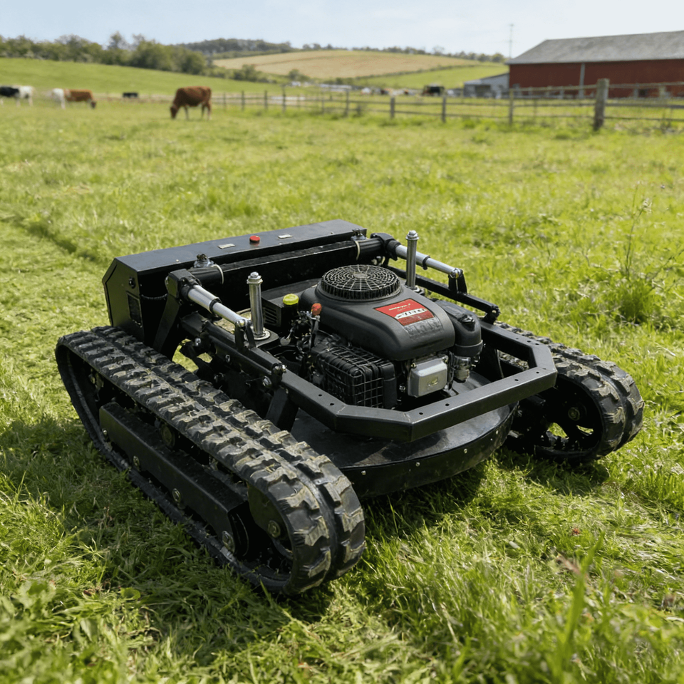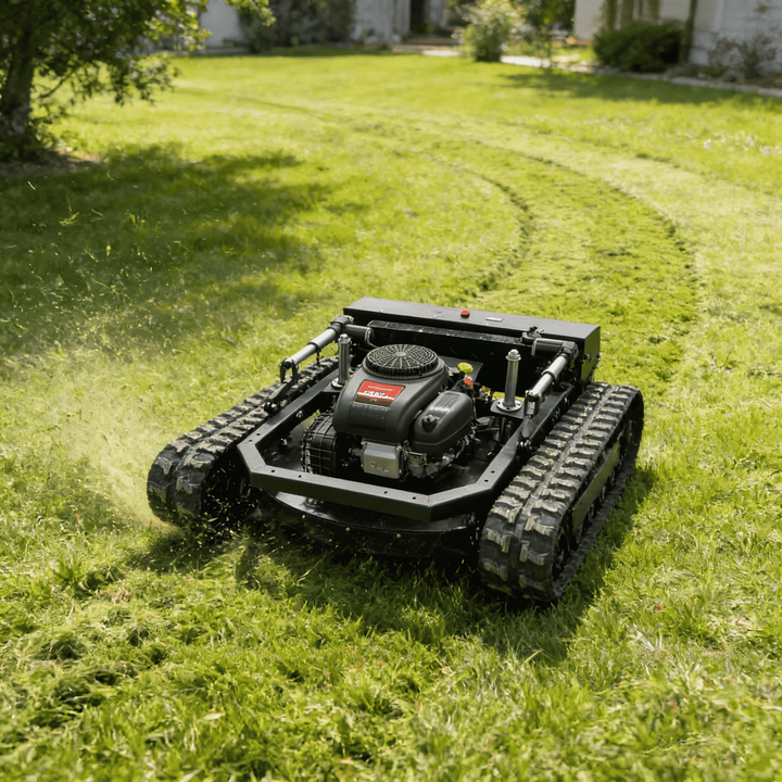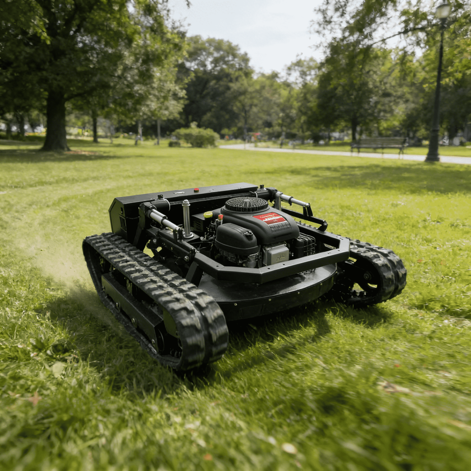 Cortadora de Césped Moderna a Gasolina con Control Remoto y Orugas de Alta Tracción para Terrenos Irregulares