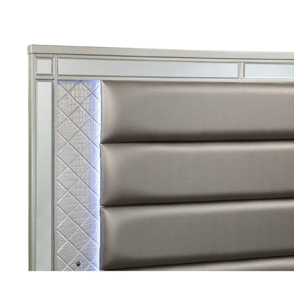 Cama Queen Size de Estilo Moderno y Glamuroso con Acabado Champán, Luces LED Blancas y Azules, Detalles de Espejo y Tapicería de Cuero Sintético