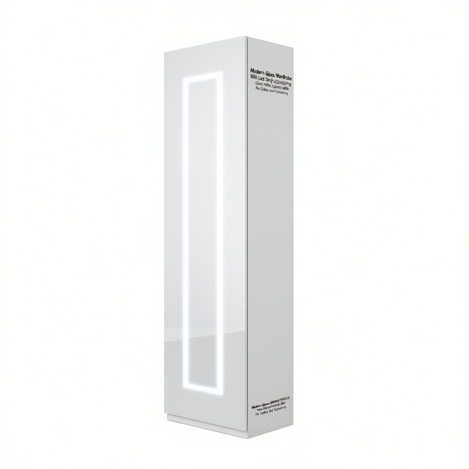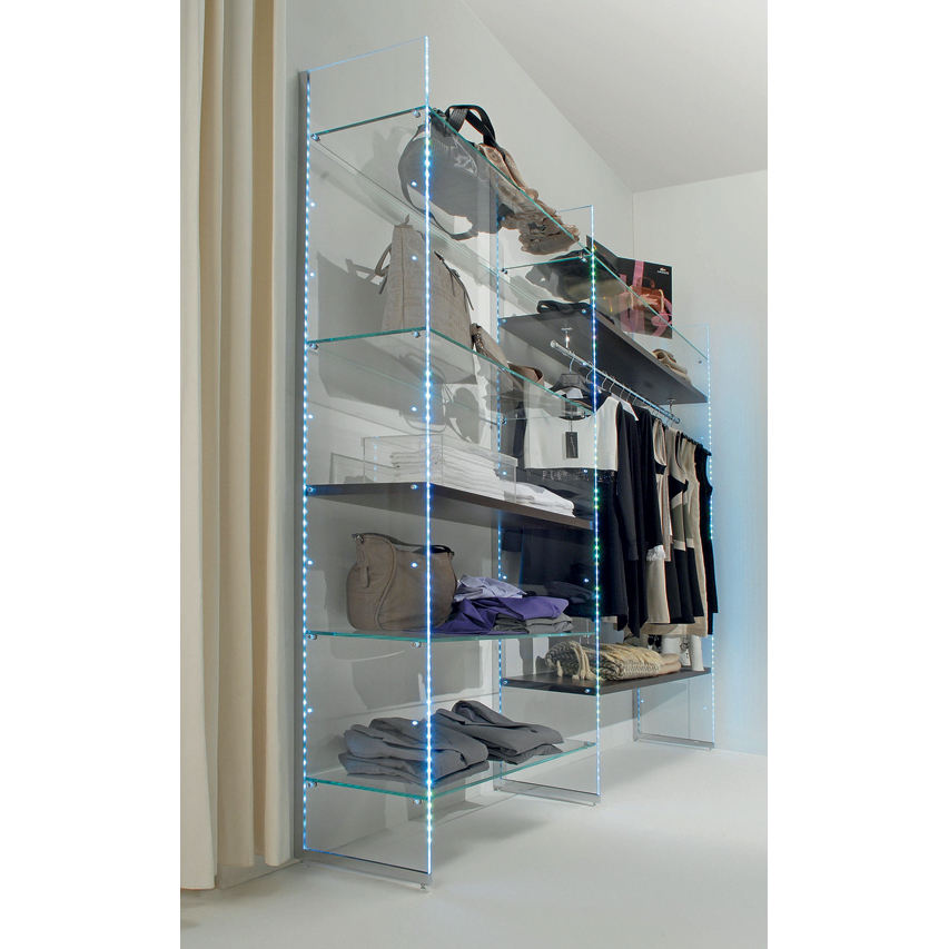 Armario moderno de vidrio con iluminación LED, 243x40xh220, armario abierto blanco brillante para ropa y accesorios