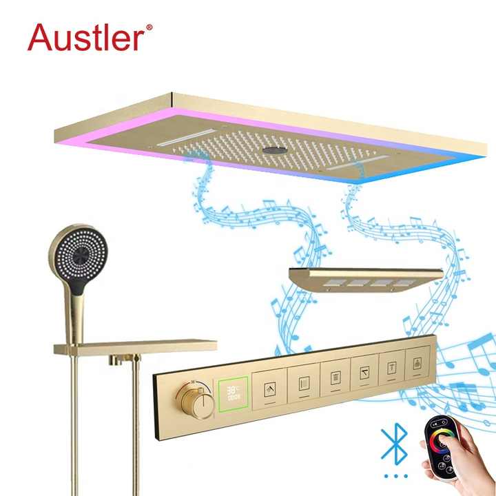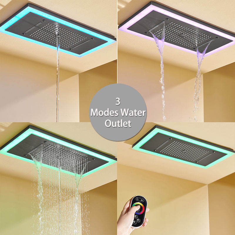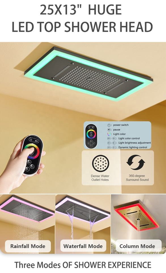 Moderno Grifo de Ducha Termostático de Latón para Baño con Cabezal de Ducha LED de 25x13 pulgadas con Efecto Lluvia y Cascada, Empotrable en Techo, Dorado