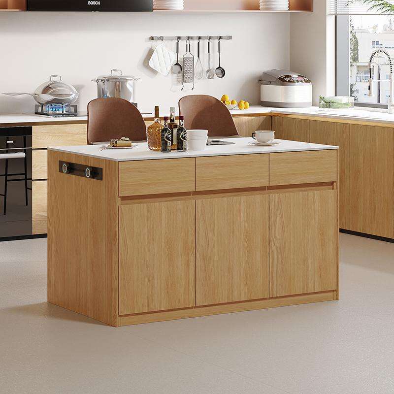 Isla de Cocina Moderna de Granito con Barra de Desayuno, Encimera de Mármol, Travertino y Madera, Gabinetes de Cocina de Melamina para Restaurante o Villa