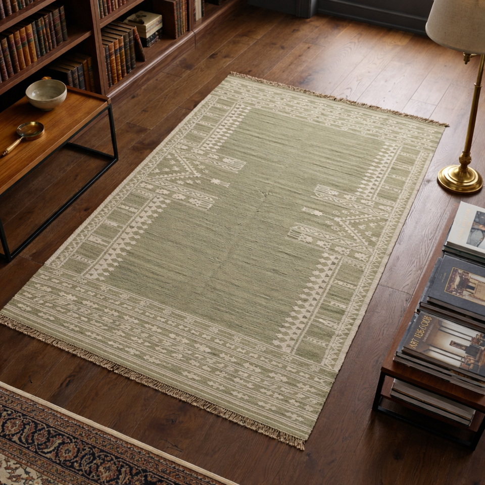 Alfombra Moderna Verde Kilim Dhurrie, Hecha a Mano, Minimalista, de Tejido Plano
