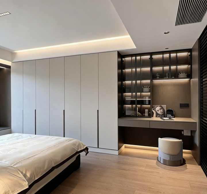 Armario Empotrado Gris Moderno - Escritorio Integrado y Luces LED, Almacenamiento Minimalista para Dormitorio u Oficina en Casa