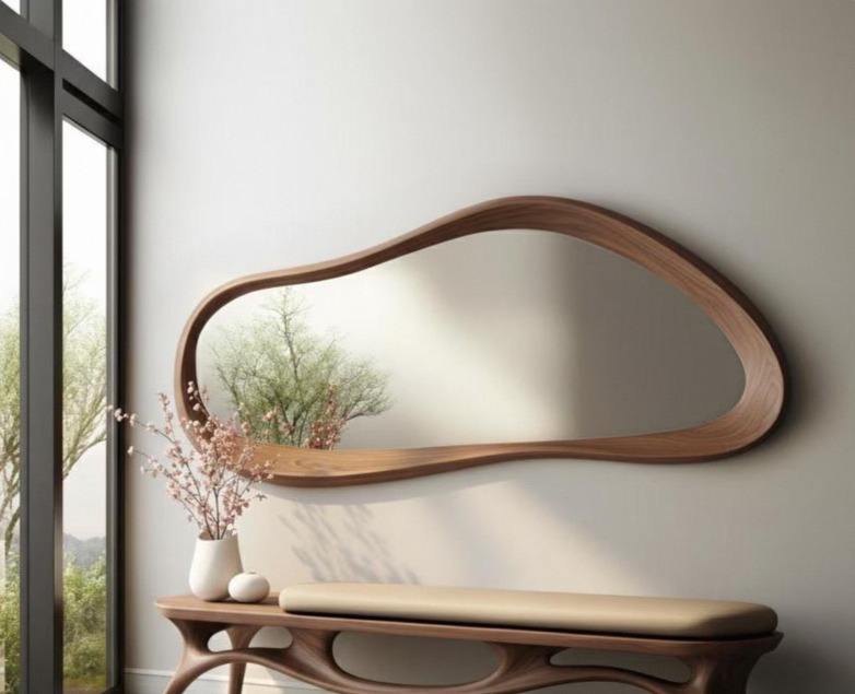 Espejo Decorativo Redondo de Madera de Nogal Real Hecho a Mano, Estilo Art Deco, Ecológico, de Cuerpo Entero, con Marco Irregular, al Mejor Precio