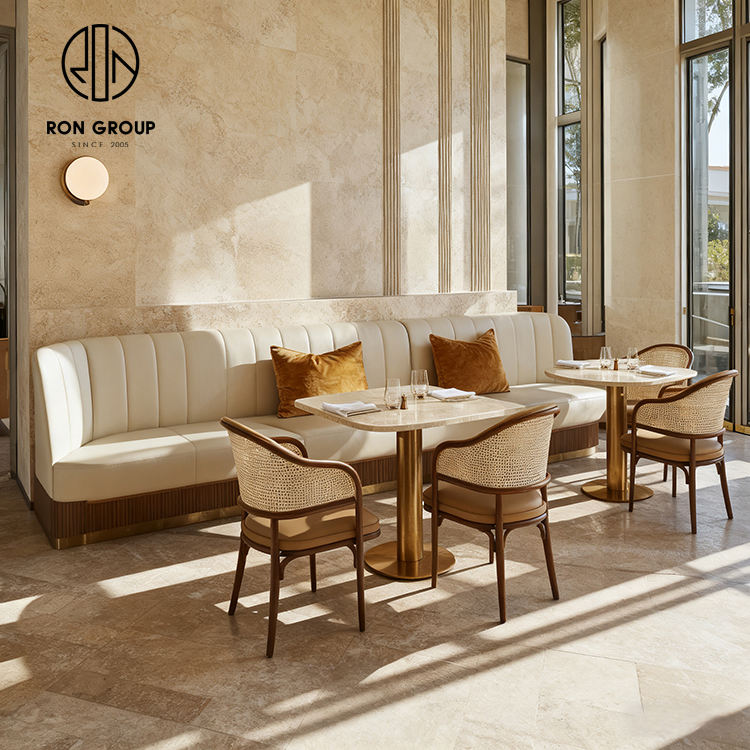 Juego de Muebles Modernos de Alta Gama para Cafetería y Restaurante, Mesa de Piedra Sinterizada, Ratán y Cuero, Sofá y Sillas
