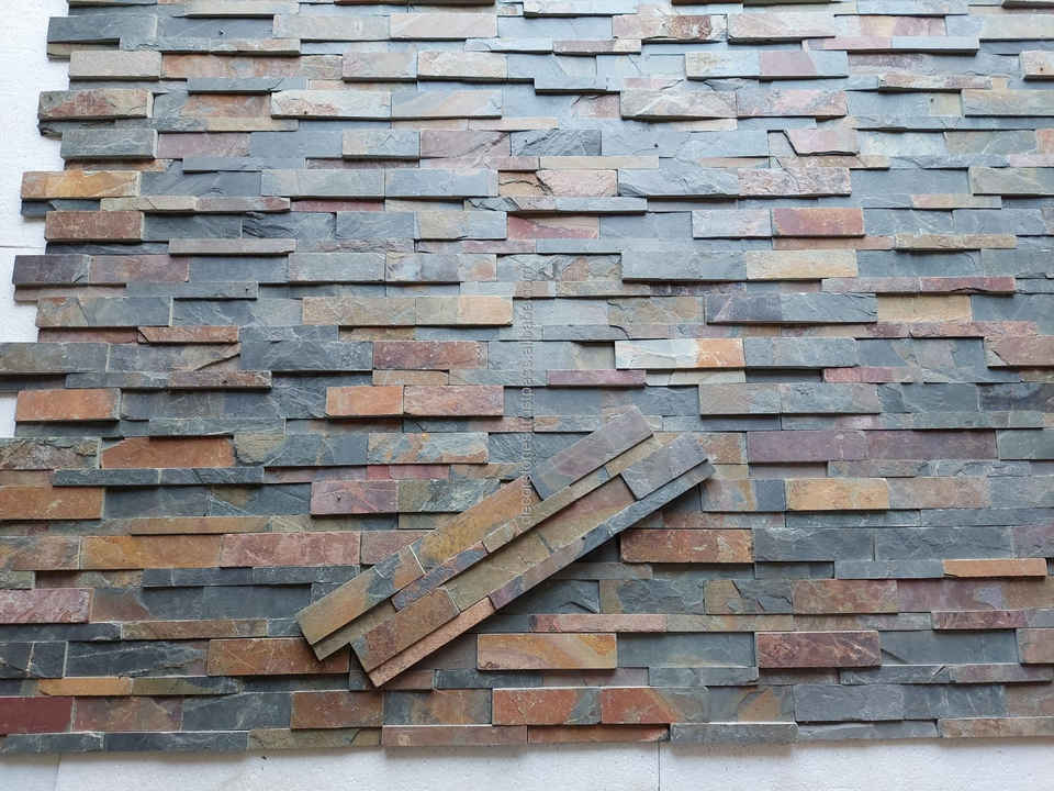 Paneles de piedra para revestimiento de pared apilados superficie natural decorativa en forma de Z cara dividida pizarra India multicolor para uso en hotel moderno