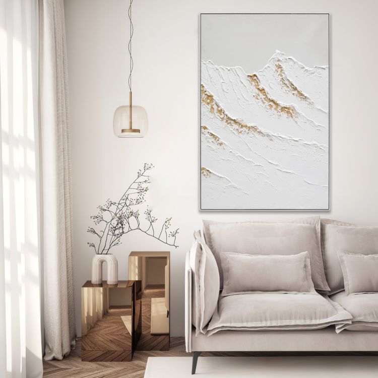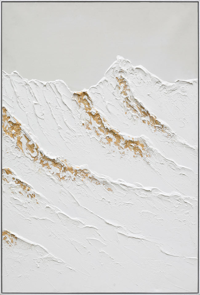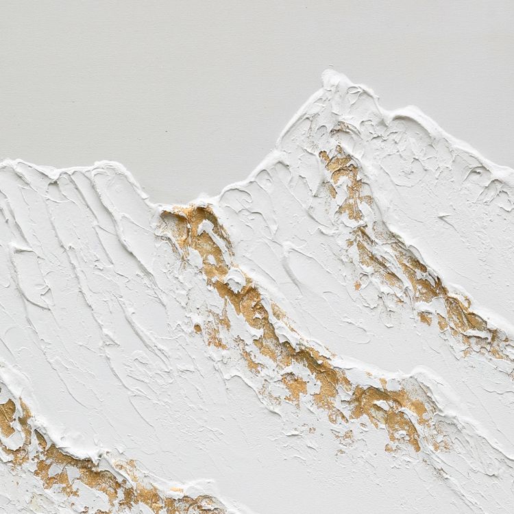 Pintura al Óleo Moderna Impresionista Pintada a Mano con Textura 3D, Picos Blancos con Detalles Dorados, Paisaje Montañoso para la Pared de la Sala de Estar