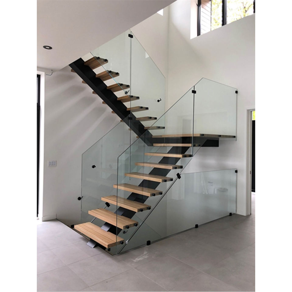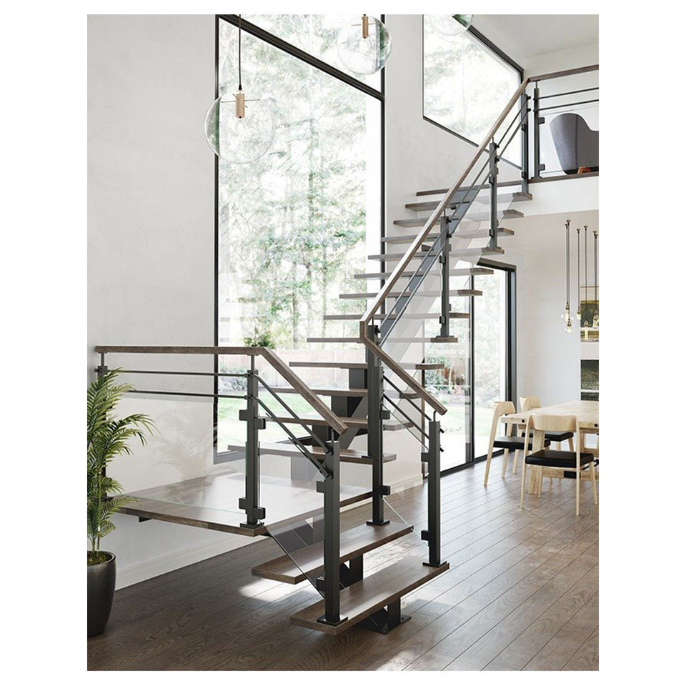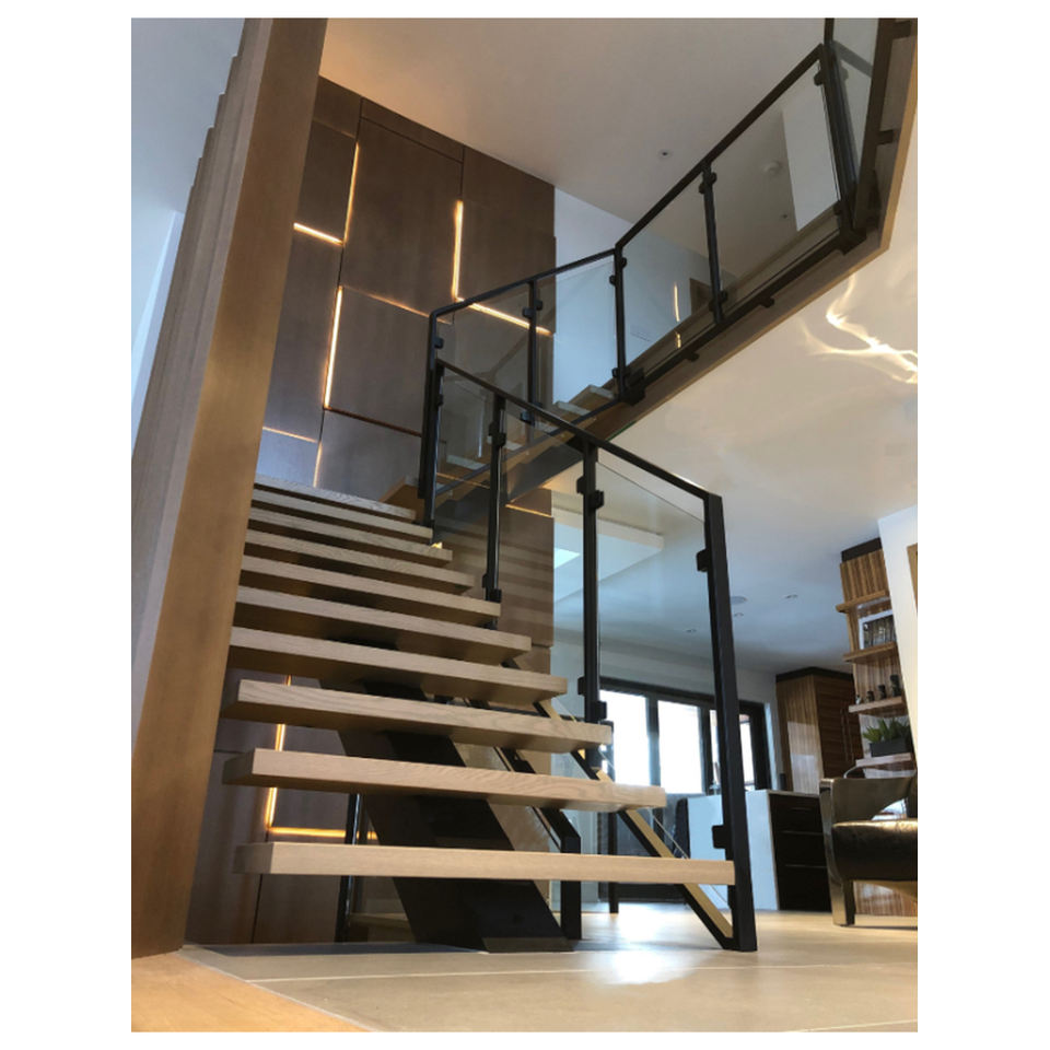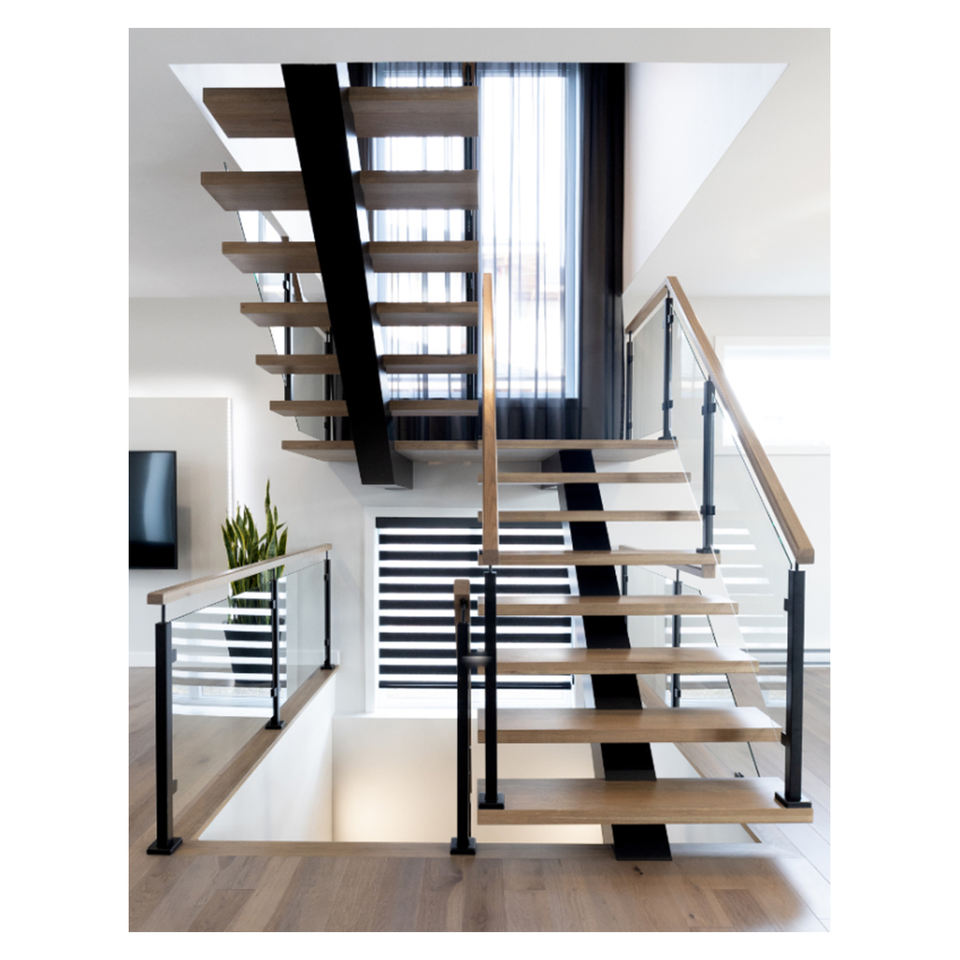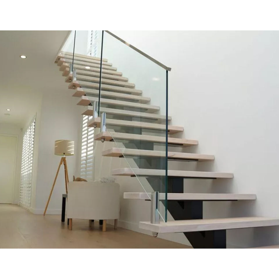 Escalera Moderna Interior de Acero con Viga Central, Escalones de Madera Maciza y Barandilla de Vidrio