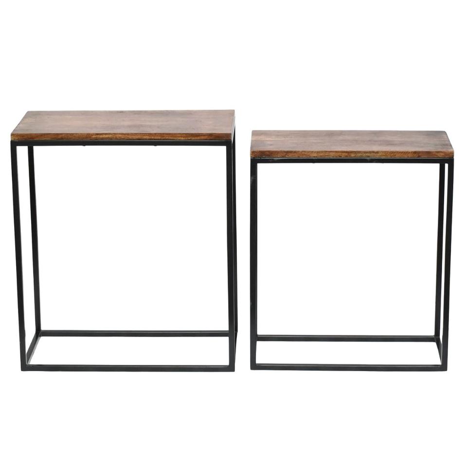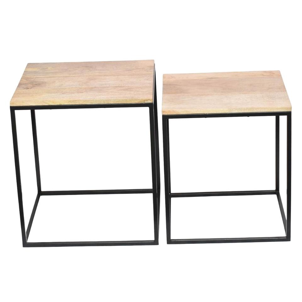 Juego de mesa cuadrada de hierro moderna de 2 uds con embalaje anidado superior de madera y acabado de recubrimiento de polvo negro inferior