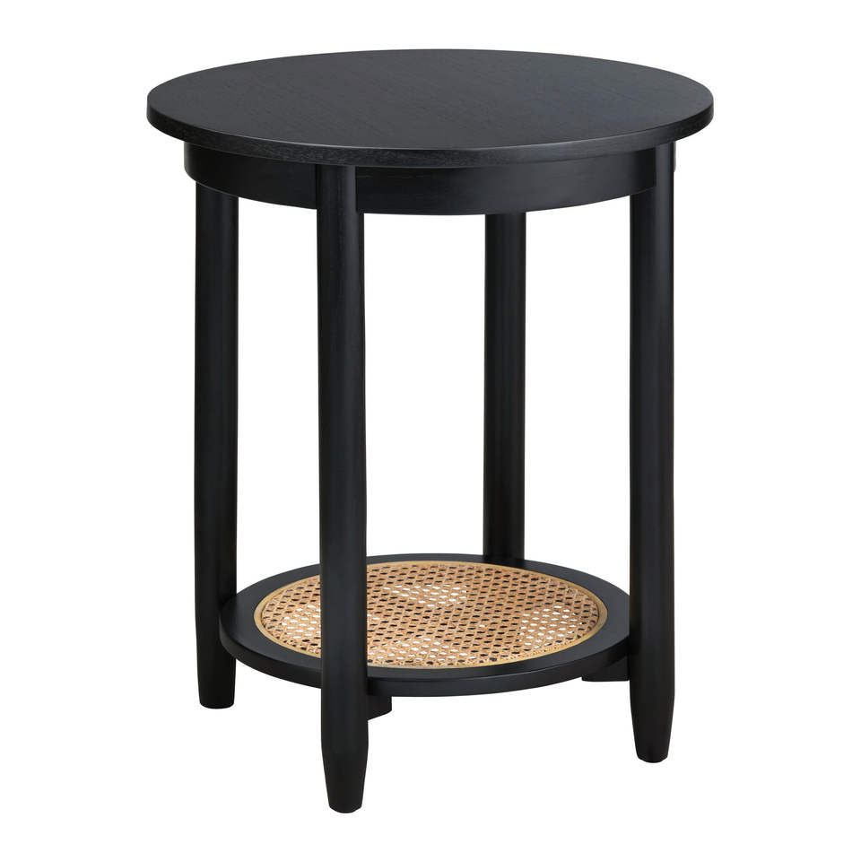 Reposapiés otomano redondo de tela 007 Boucle con estantería de madera, taburetes negros y solución de almacenamiento de otomanos