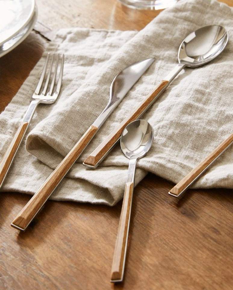 Juego de cubiertos metálicos modernos para cocina con mango de madera, utensilios de acero inoxidable pulido para comidas elegantes diarias