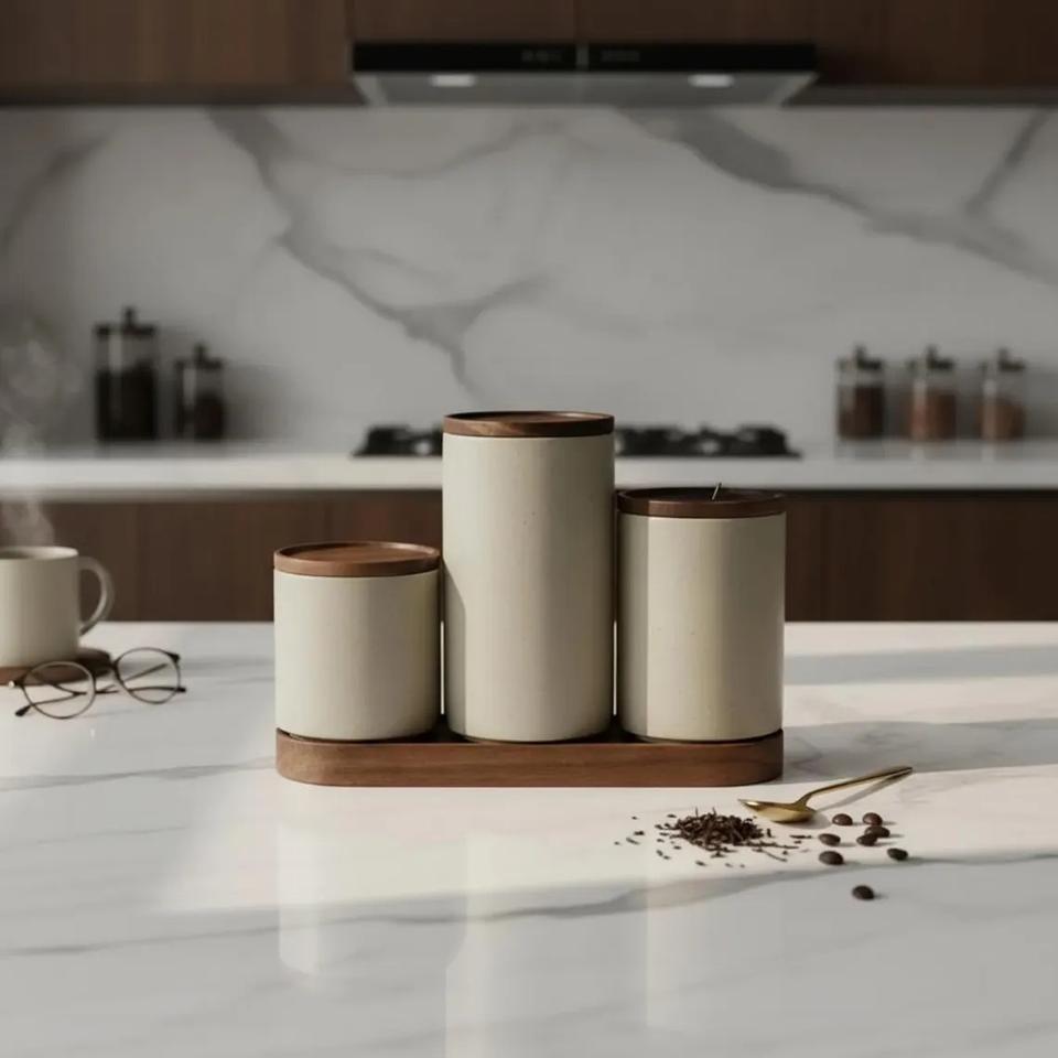 Juego de Recipientes de Almacenamiento para Cocina Moderna con Soporte de Madera, Diseño de Tapa Hermética, Organizador de Encimera que Ahorra Espacio, Solución Elegante para Despensa