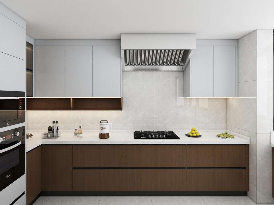 Gabinetes de Cocina Modernos en Forma de L, Acabado en Melamina Blanca y con Veteado de Madera, con Iluminación