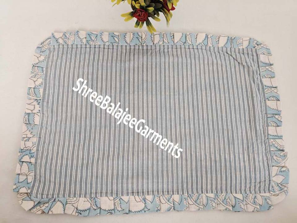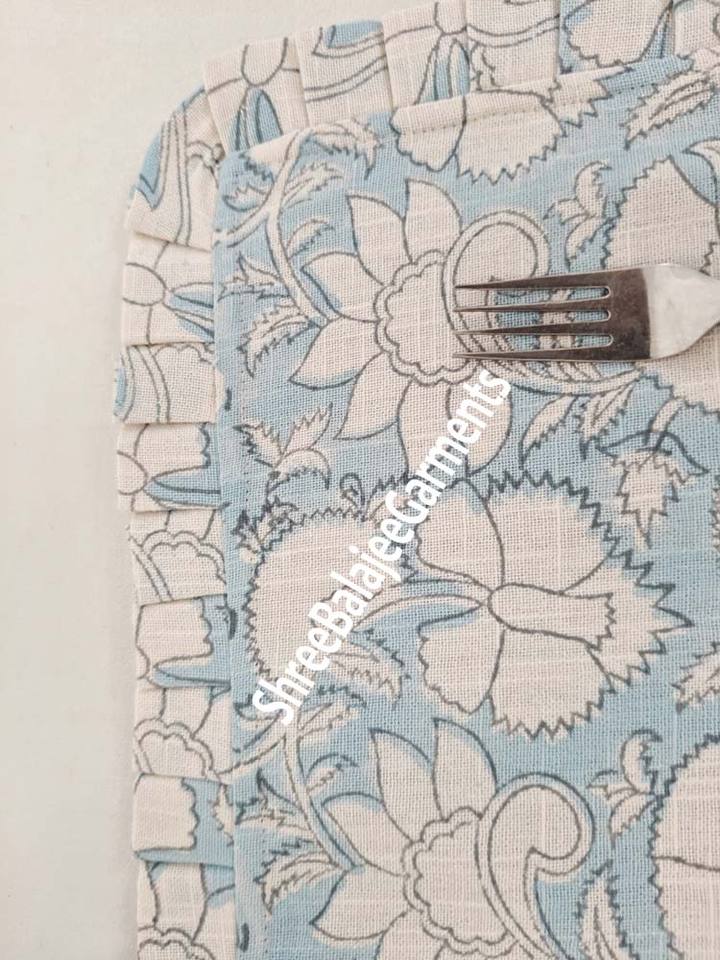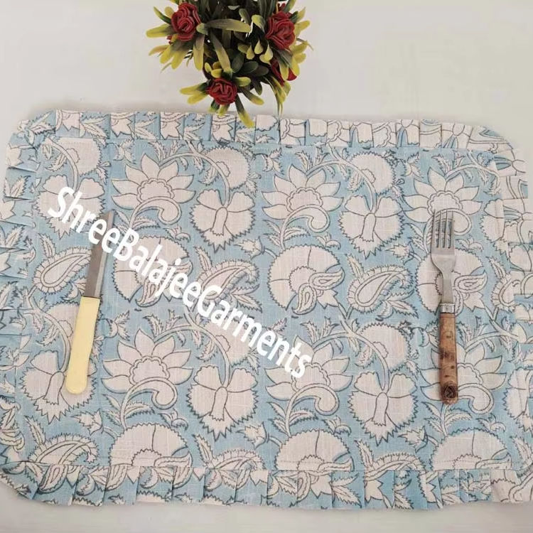 Manteles individuales rectangulares azules claros modernos, estampado de bloques de mano florales, decoración de banquete desechable con volantes para el hogar, cocina, boda, comedor