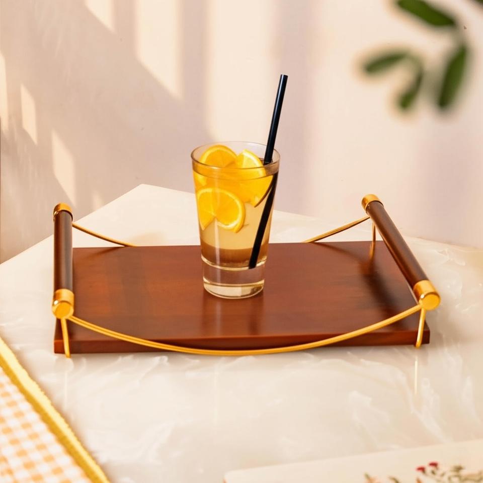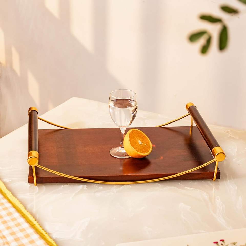 Bandeja Decorativa Moderna de Madera Ligera con Asas de Metal Dorado, Forma Rectangular para Ocasiones Festivas, Diwali, Cumpleaños, Pascua