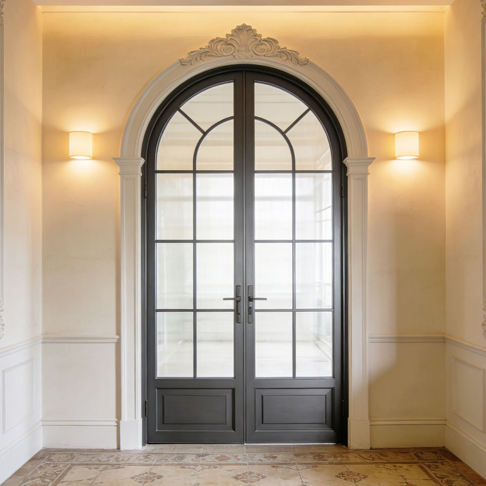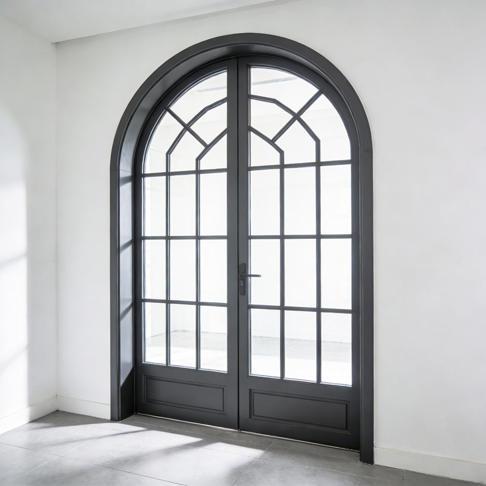 Puerta Francesa de Aluminio con Marco Arqueado, Triple Acristalamiento, Diseño Lineal Moderno con Tornillos Ocultos y Herrajes Silenciosos para Patio