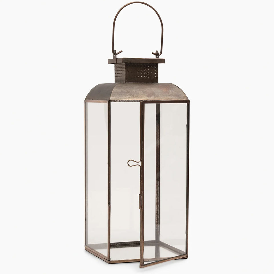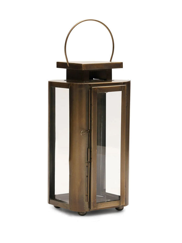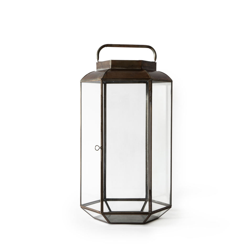 Farol moderno de metal y vidrio con acabado en bronce, centro de mesa para decoración de bodas al aire libre, hecho a mano.