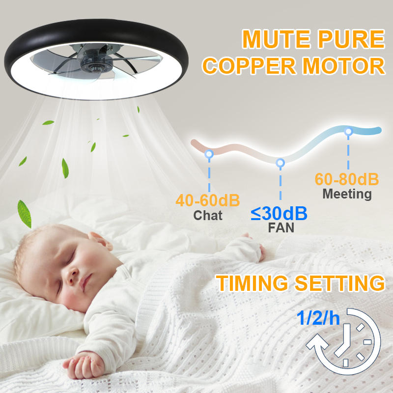 Ventilador de Techo Moderno de Perfil Bajo con 5 Aspas para Dormitorio, Cuerpo de Metal Negro, Luz LED, Motor de CC de 6 Velocidades de Bajo Ruido, Control Remoto y por Aplicación
