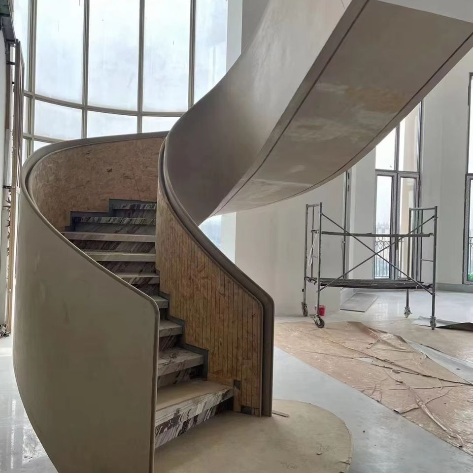 Escalera de arco interior de diseño de lujo moderno Marco de acero galvanizado de alta resistencia Apartamento de vidrio templado de metal de hierro forjado