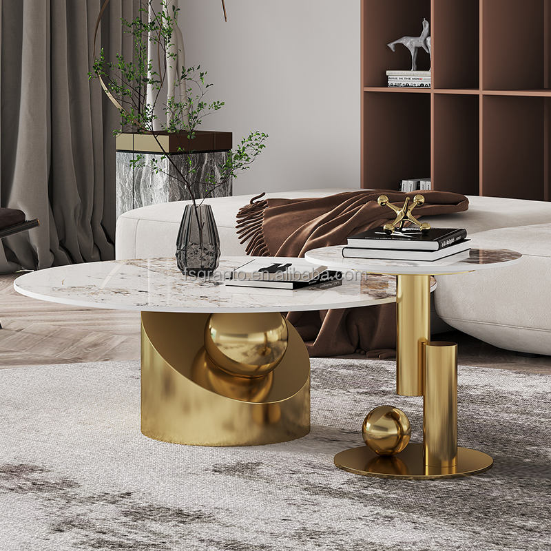 Juego de Mesa de Centro Extensible de Lujo Moderno con Estructura de Acero Inoxidable, 2 Mesas Redondas Centrales y Mesa Auxiliar, Muebles de Interior