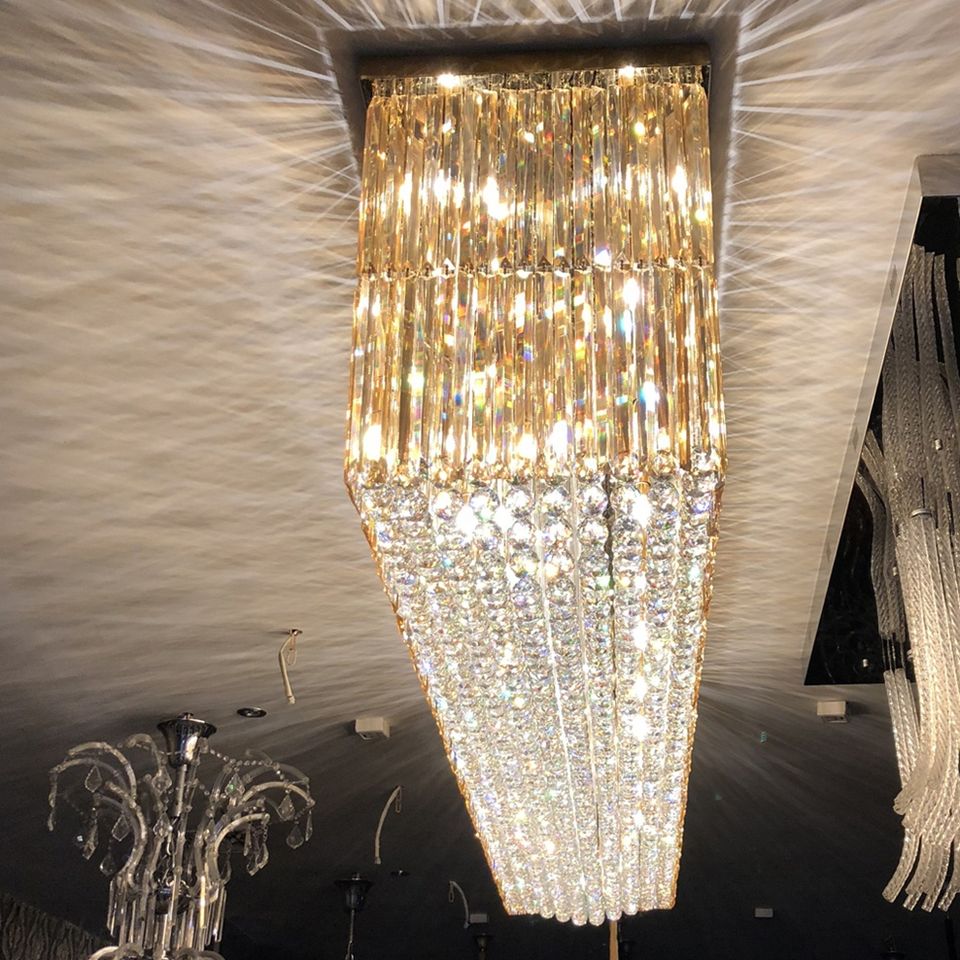 Candelabro de cristal colgante K9 de lujo moderno, piezas doradas, estilo contemporáneo para vestíbulo de hotel grande para diseño interior contemporáneo