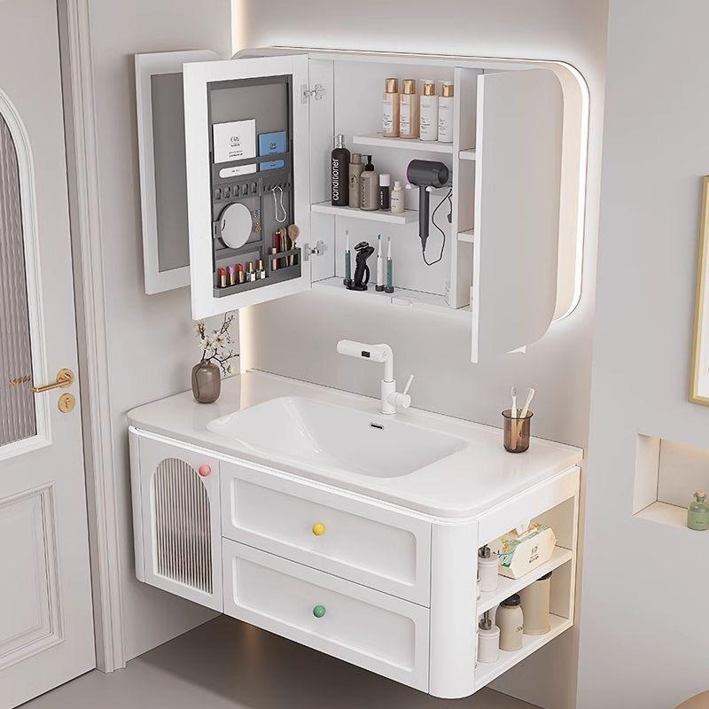 Mueble de Baño Moderno de Pared con Lavabo Integrado de MDF, Espejo con Iluminación Inteligente y Característica Resistente al Agua