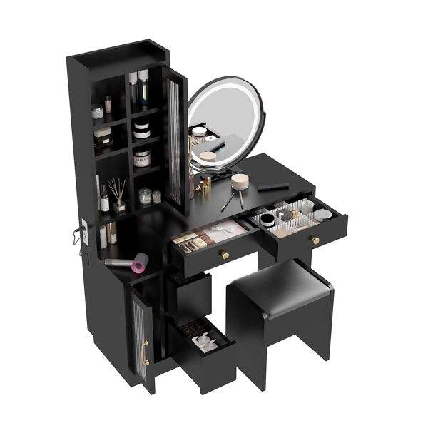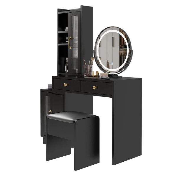 Modern Makeup Vanity Table Set with LED Mirror and Retractable Power Outlets 3 Light Colors Includes Side Cabinet
