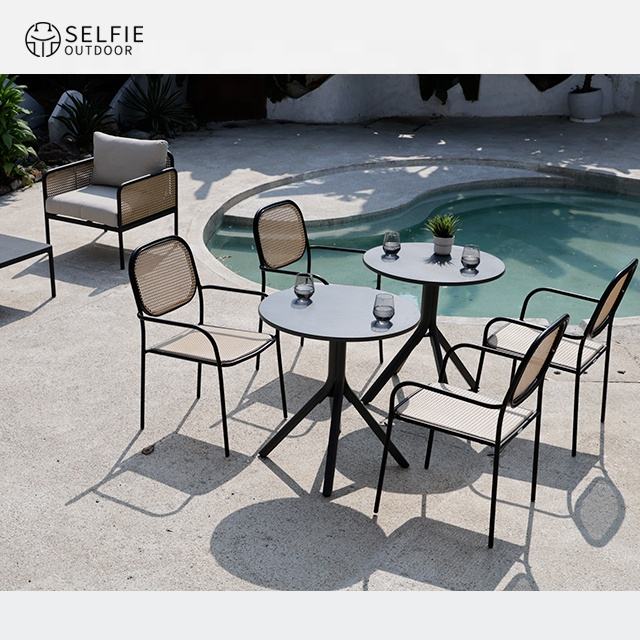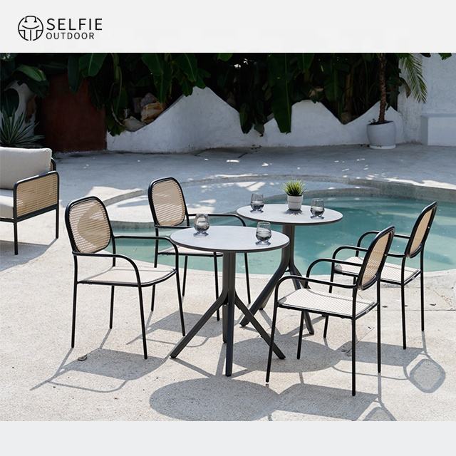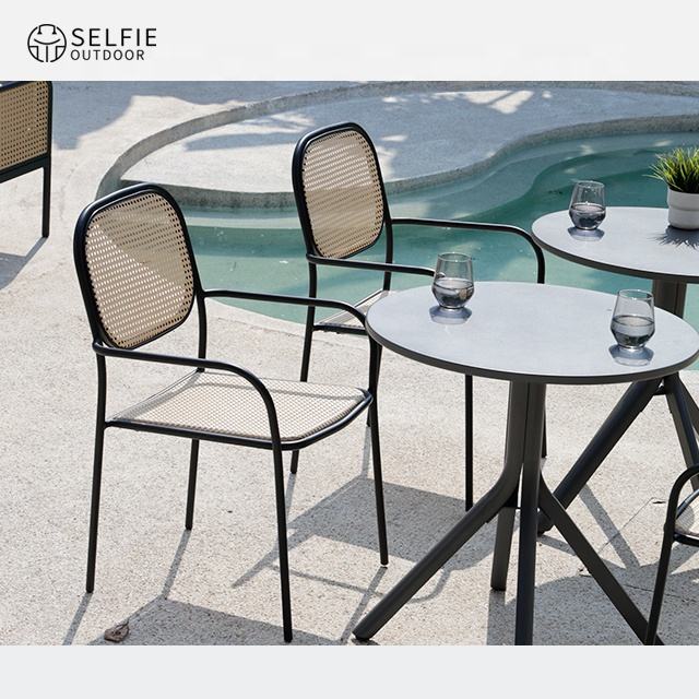 Silla de comedor moderna de ratán para exteriores con estructura de metal para eventos de hoteles y villas resistente a los rayos UV