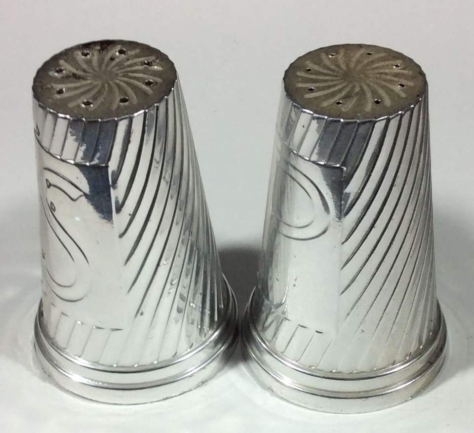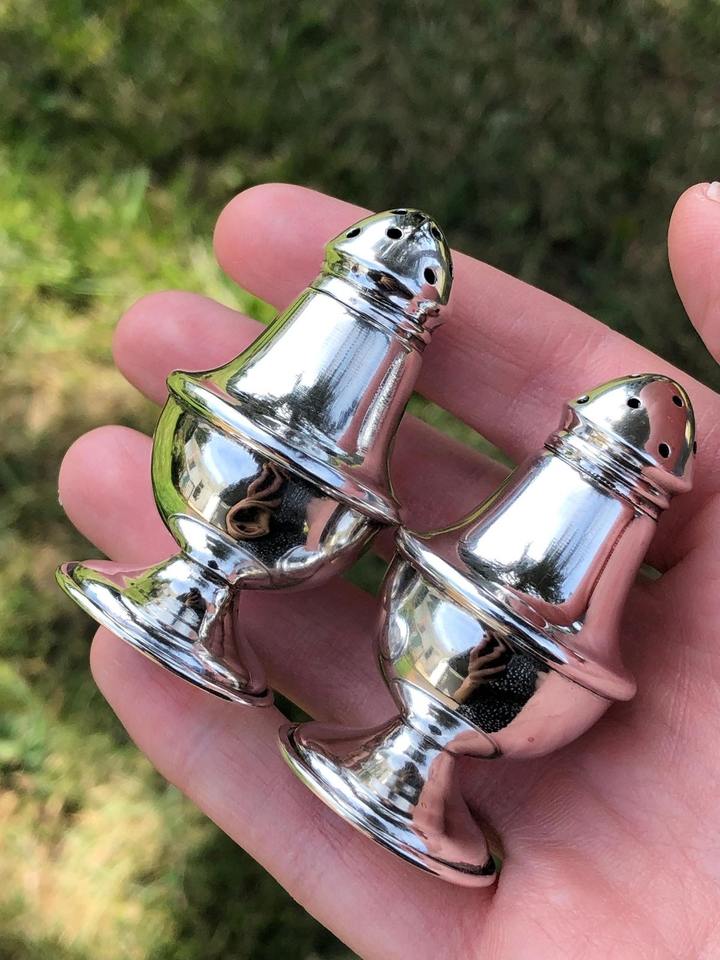 Juego de salero y pimentero moderno de metal con elegante acabado de acero inoxidable para el hogar, cocina, comedor y servicio en cafeterías.