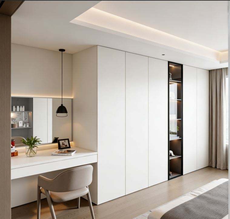 Conjunto de Dormitorio Moderno y Minimalista con Armario Integrado, Escritorio, Cama Tatami con Gabinete de Almacenamiento y Organización de Espacio