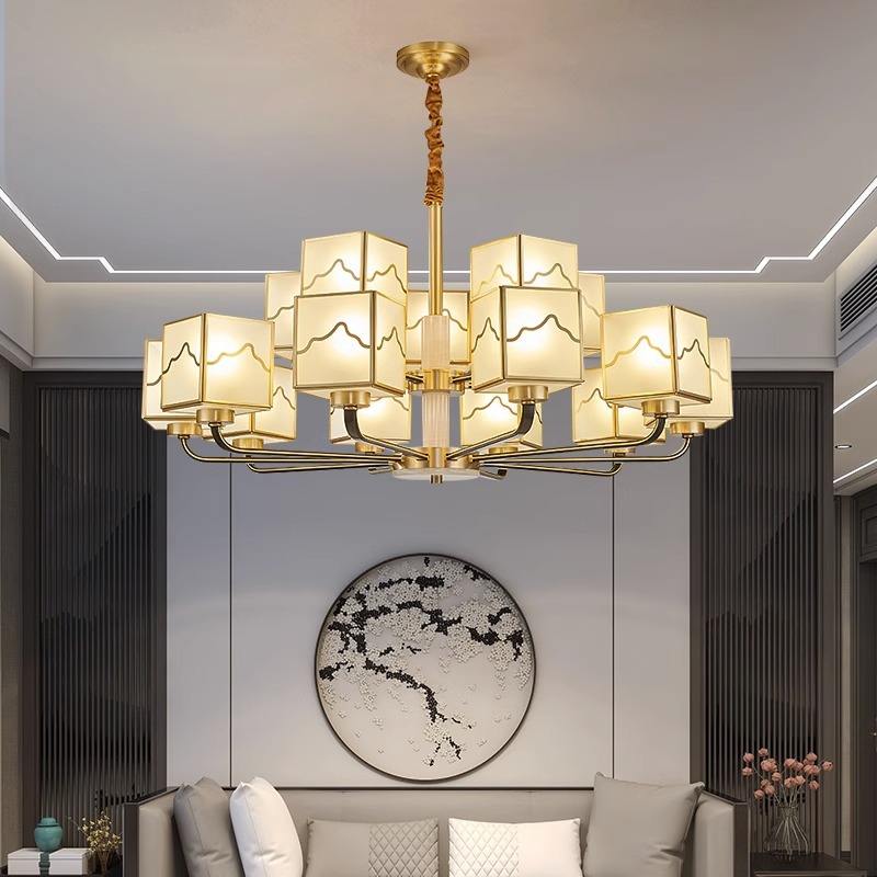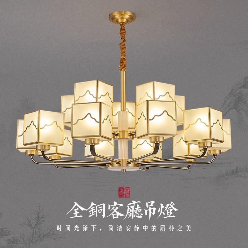 Lámpara de Araña Moderna Minimalista de Estilo Chino, Totalmente en Cobre, Tamaño Mediano, LED de Lujo, para Sala de Estar, Comedor, con Cristal