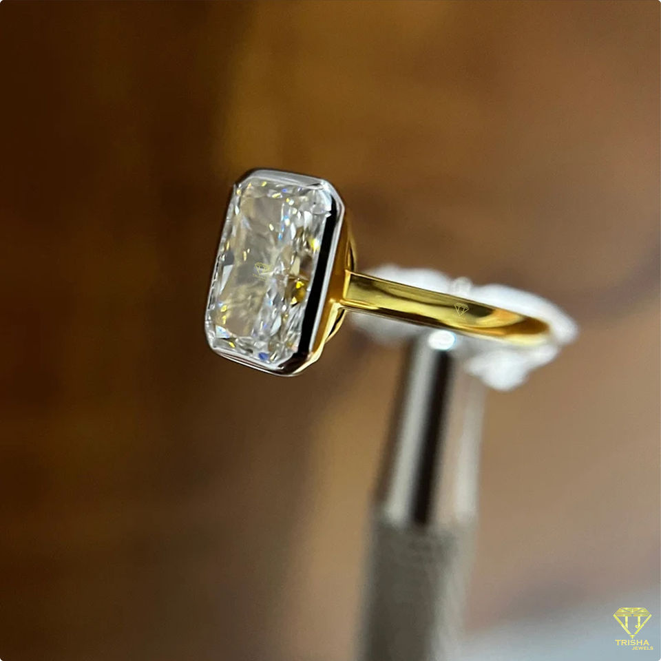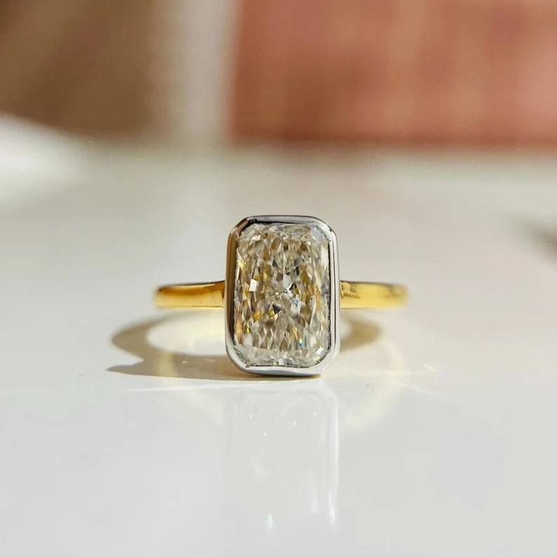 Anillo solitario de corte radiante minimalista moderno, conjunto de bisel de dos tonos, joyería de compromiso y boda para ella