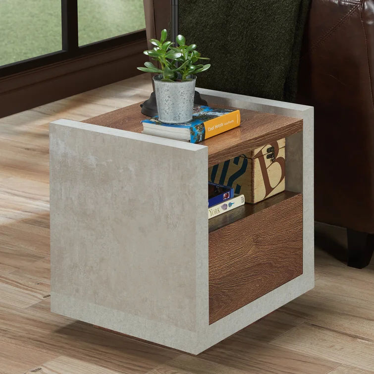 Mesita de noche interior de hormigón de estilo minimalista moderno con armario de almacenamiento de madera