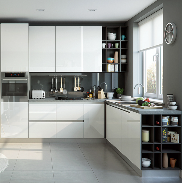 Gabinetes de Cocina Modulares Modernos, Estructura de Madera Contrachapada de Alto Brillo, Puertas Lacadas, 5+ Cajones, Accesorios de Bisagra, Aplicación en Villas, 3 Años de Garantía