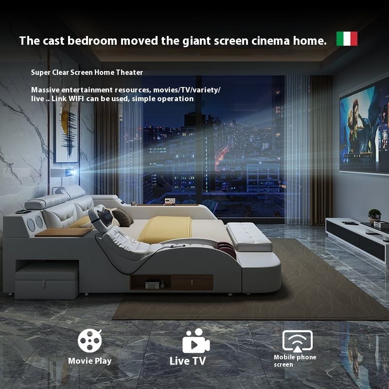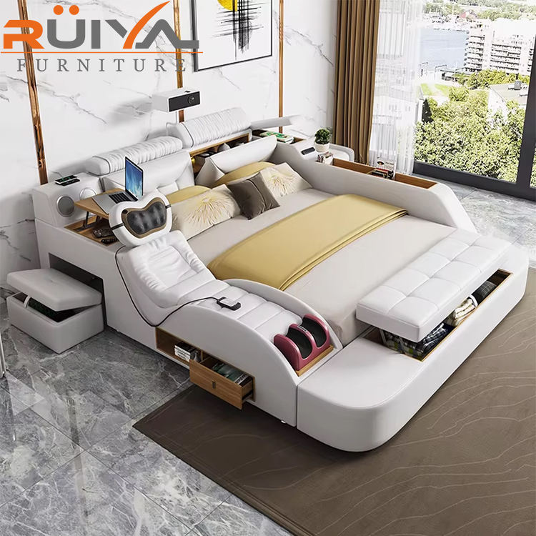 Cama inteligente moderna multifunción con cargador USB y multimedia, tapizada en piel genuina, mueble de dormitorio con masaje, cama blanda tipo cine familiar
