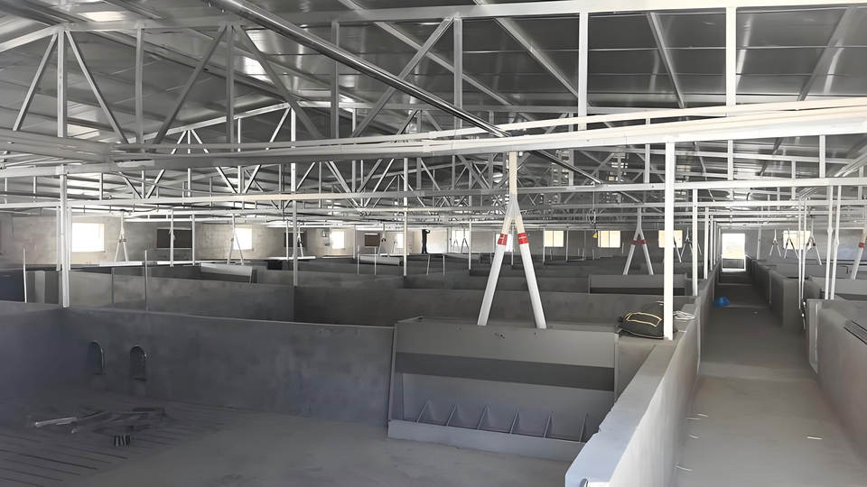 Edificio de estructura de acero de diseño moderno para granja lechera agrícola al aire libre, establo de vacas con estructura de acero.